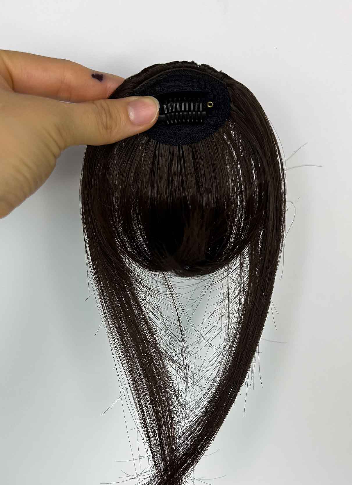 Cerquillo postizo de cabello liso premium. Fabricado con fibras de alta calidad que imitan perfectamente el brillo y la textura del cabello natural, sin necesidad de cortar tu pelo puedes tener un resultado al instante. Practico de usar con clip interno para un ajuste completamente seguro. Se puede lavar, planchar y peinar.