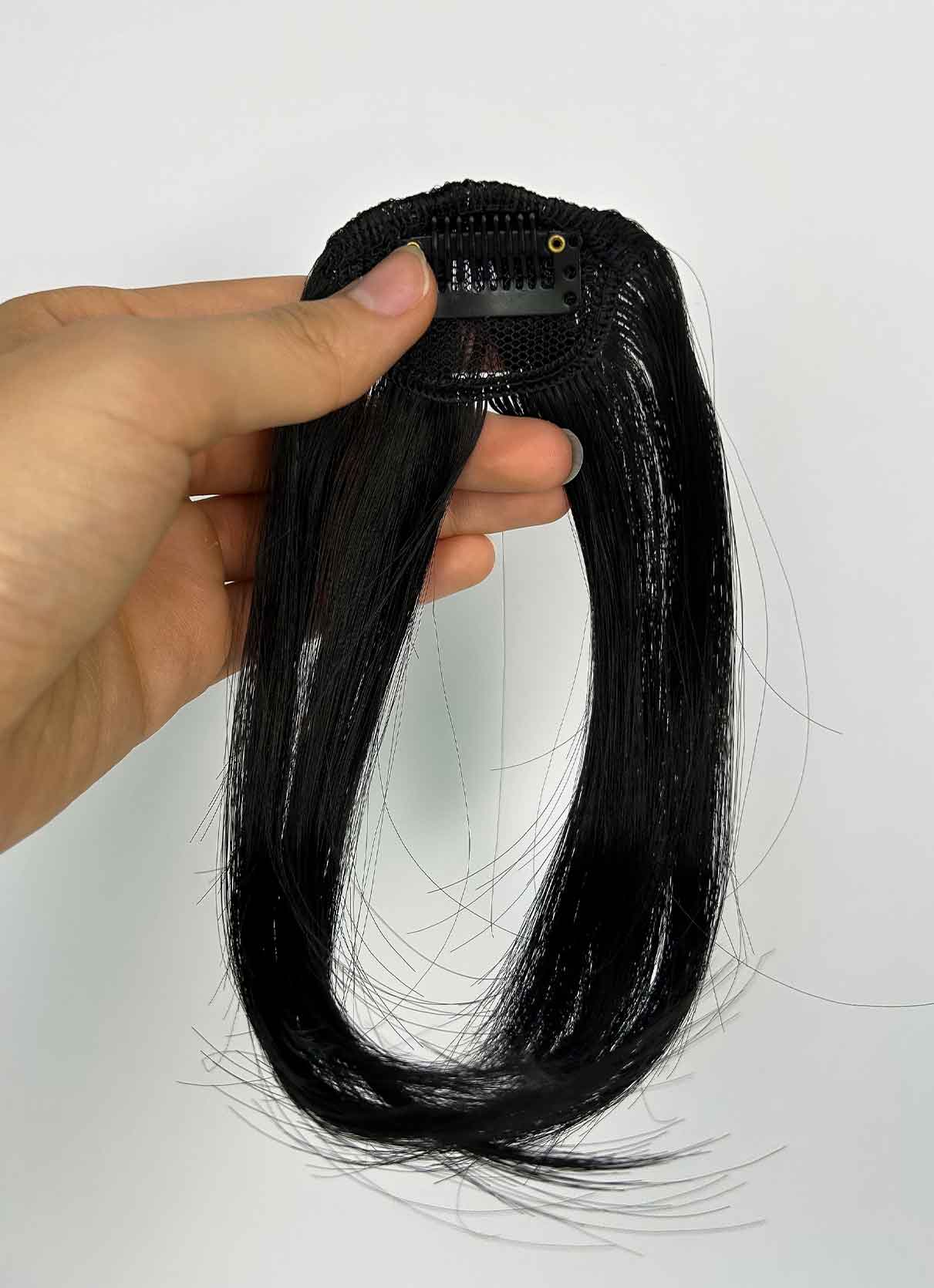 Flequillo postizo de cabello liso. Fabricado con fibras resistente a altas temperaturas, que imitan perfectamente el brillo y la textura del cabello natural, sin necesidad de cortar tu pelo puedes tener un resultado al instante. Practico de usar con clip interno para un ajuste completamente seguro. Se puede lavar, planchar y peinar.